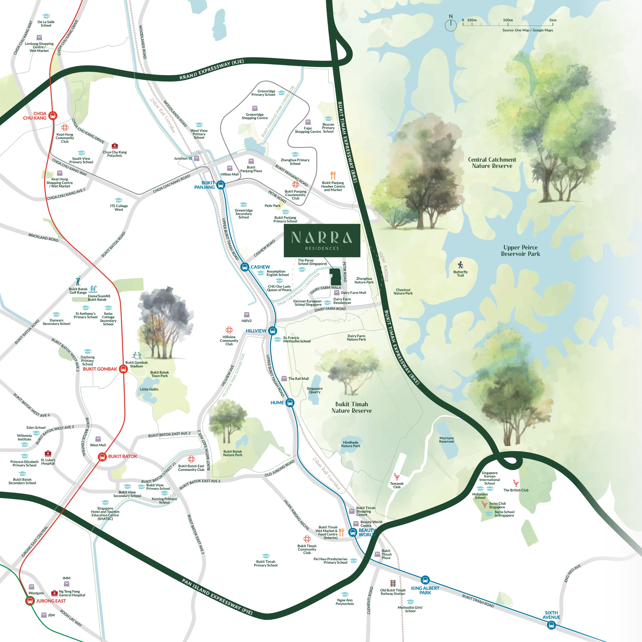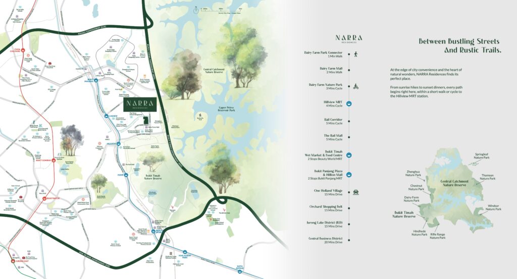 Narra Residences sits within the tranquil Dairy Farm enclave, beside the reservoir and forest reserve, surrounded by low-density homes and protected greenery. For daily travel, Hillview MRT on the Downtown Line is about a 10-minute walk away, while major roads like BKE and PIE are nearby—around a 5-minute drive to access the PIE.